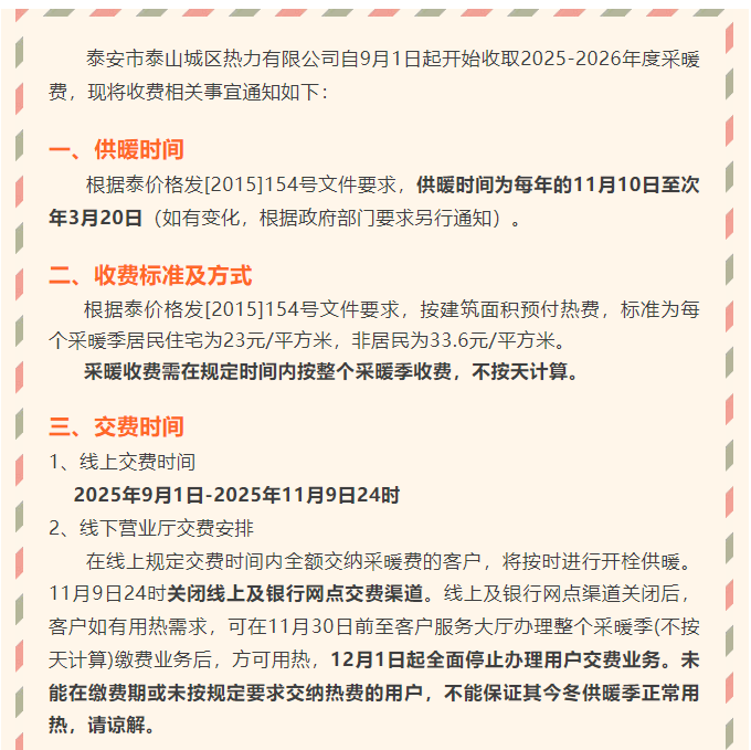 泰山城區(qū)熱力有限公司2025-2026年度采暖費(fèi)收費(fèi)通知