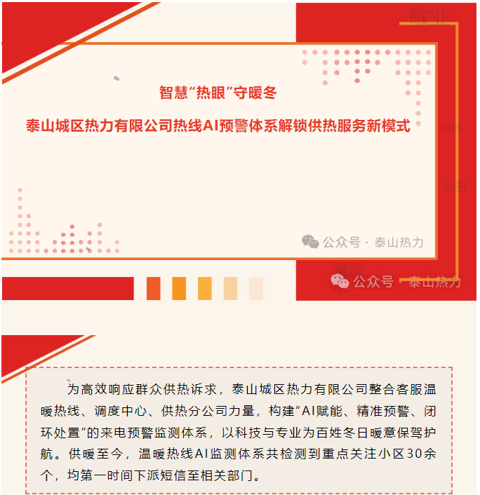 智慧“熱眼”守暖冬—泰山城區(qū)熱力有限公司熱線AI預(yù)警體系解鎖供熱服務(wù)新模式