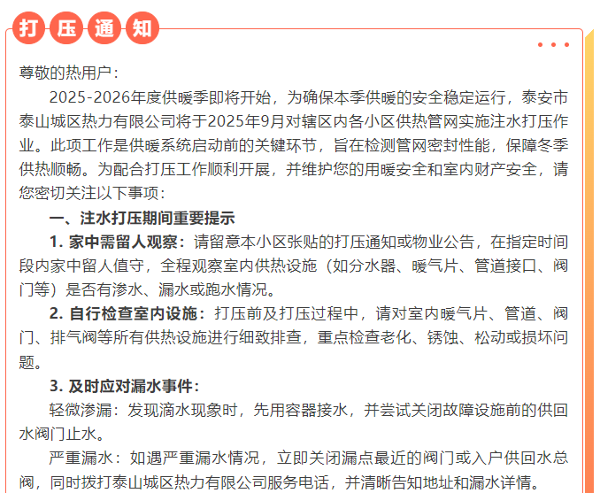 【溫馨提示】泰山城區(qū)熱力有限公司將于九月開啟管網(wǎng)注水打壓測(cè)試敬請(qǐng)廣大市民留意